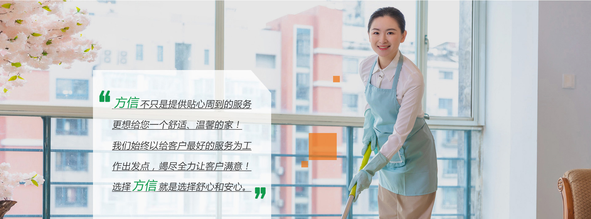 方信家不只是提供贴心周到的服务更想给您一个舒适、温馨的家!我们始终以给客户最好的服务为工作出发点,竭尽全力让客户满意!选择方信家就是选择舒心和安心。